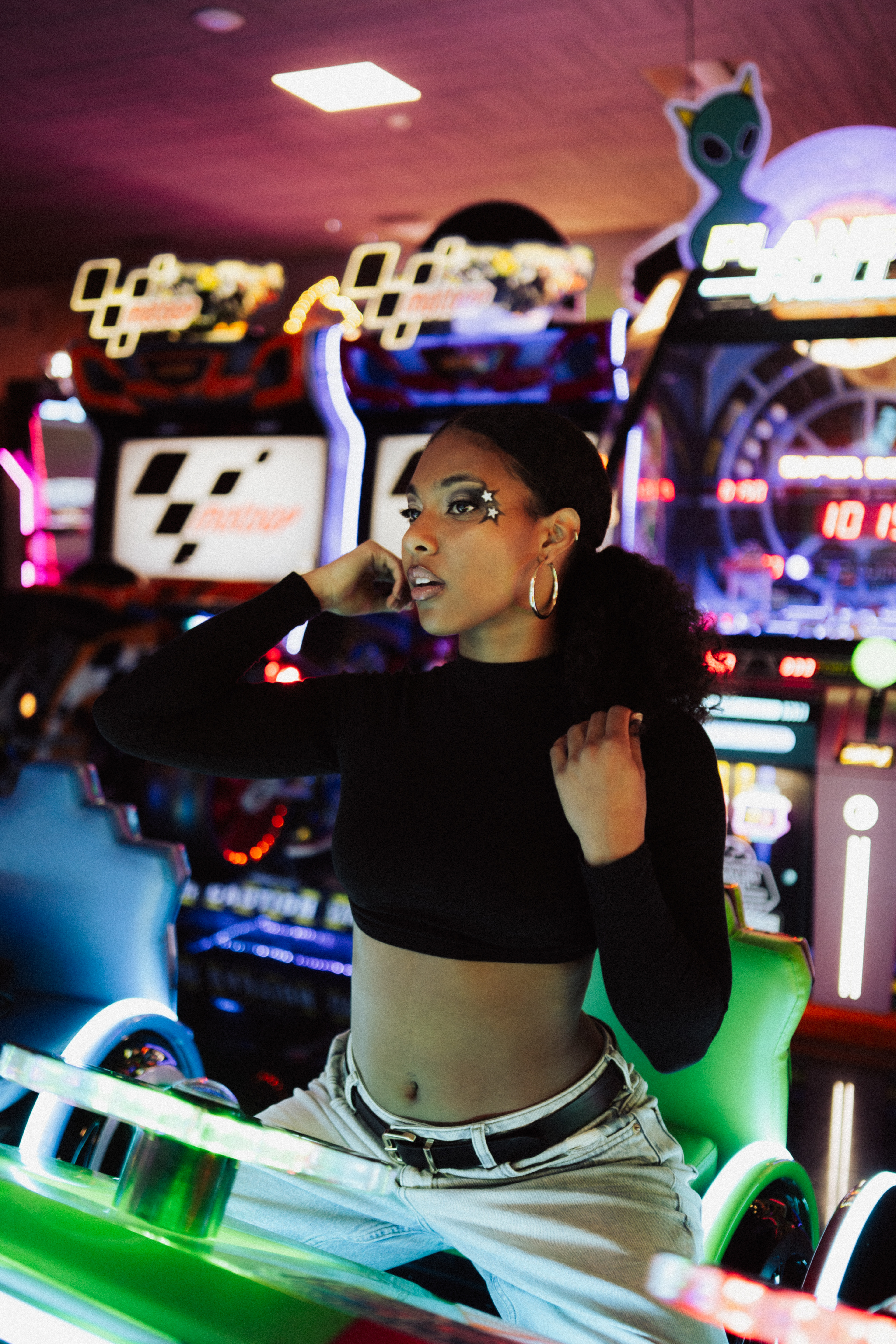 Y2K Arcade Tipologia: Makeup editoriale, artistico; Caratteristiche:Makeup fortemente ispirato agli anni 2000, caratterizzato da stelle luminose che contrastano con la pelle della modella. Le labbra richiamano chiaramente la moda dei primi anni 2000; Type: Editorial, artistic makeup; Features: A makeup look heavily inspired by the 2000s, featuring bright stars that contrast with the model’s skin. The lips are a clear reference to early 2000s fashion;